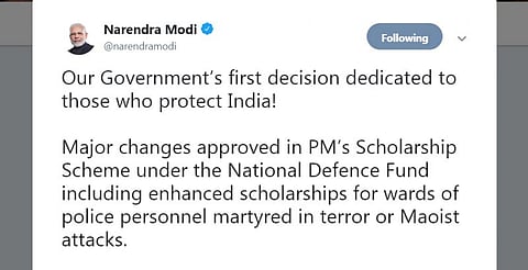 नई दिल्ली (आईएएनएस)। प्रधानमंत्री नरेंद्र मोदी की सरकार के दूसरे कार्यकाल की पहली मंत्रिपरिषद की बैठक यहां हुई। पहले फैसले में राष्ट्रीय रक्षाकोष के तहत प्रधानमंत्री छात्रवृत्ति योजना में बड़े बदलाव को मंजूरी दी गई। प्रधानमंत्री नरेंद्र मोदी ने ट्वीट कर कहा, हमारी सरकार का पहला निर्णय भारत की रक्षा करने वालों को समर्पित है।नरेंद्र मोदी ने ट्वीट में कहा, राष्ट्रीय रक्षा कोष के तहत प्रधानमंत्री छात्रवृत्ति योजना में बड़े बदलावों को मंजूरी दी गई, जिनमें आतंक या नक्स्लवादी हमलों में शहीद हुए पुलिसकर्मियों के बच्चों को बढ़ी हुई छात्रवृत्ति देने की बात शामिल है। छात्रवृत्ति की दरें लड़कों के लिए 2,000 रुपये से 2,500 रुपये प्रति माह और लड़कियों के लिए 2,250 रुपये से 3,000 रुपये प्रति माह तक बढ़ाई गई हैं। आतंक या नक्स्लवादी हमलों में शहीद हुए राज्य पुलिसकर्मियों के बच्चों के लिए भी छात्रवृत्ति योजना की सीमा बढ़ाई गई है। राज्य पुलिसकर्मियों के बच्चों के लिए छात्रवृत्ति योजना का कोटा साल में 500 होगा। राष्ट्रीय रक्षा प्रयासों को बढ़ावा देने के लिए राष्ट्रीय रक्षा कोष (एनडीएफ) की स्थापना सन् 1962 में की गई थी।